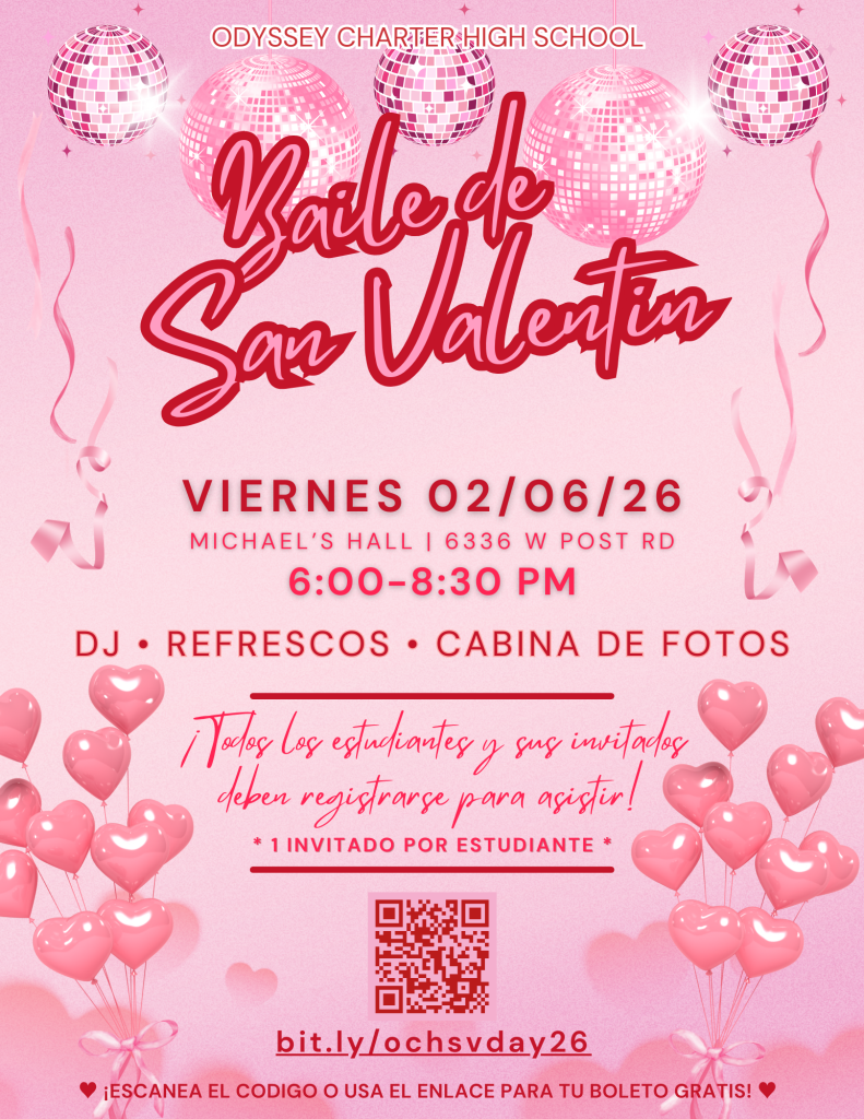 Who’s ready to warm up on the dance floor? Our Odyssey High School Valentine’s dance is Friday, February 6, 2026 from 6:00 – 8:30pm at Michael’s Hall 6336 W. Post Rd. There will be food, a fun photobooth, and plenty of music to dance to. This is a FREE event for our high schoolers, you may bring a guest or just come have a good time with your classmates!