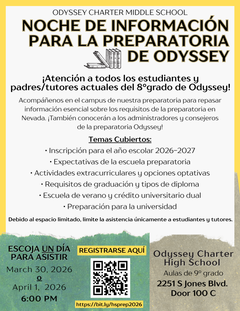 Join us for Odyssey’s High School Prep Night! Students will learn Nevada high school requirements, meet our high school administration & counselors, and learn more of what Odyssey Charter High School has to aid in their future endeavors!