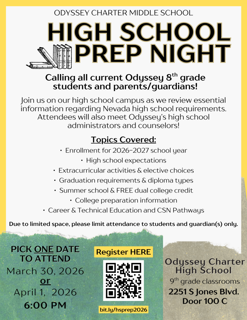 Join us for Odyssey’s High School Prep Night! Students will learn Nevada high school requirements, meet our high school administration & counselors, and learn more of what Odyssey Charter High School has to aid in their future endeavors!