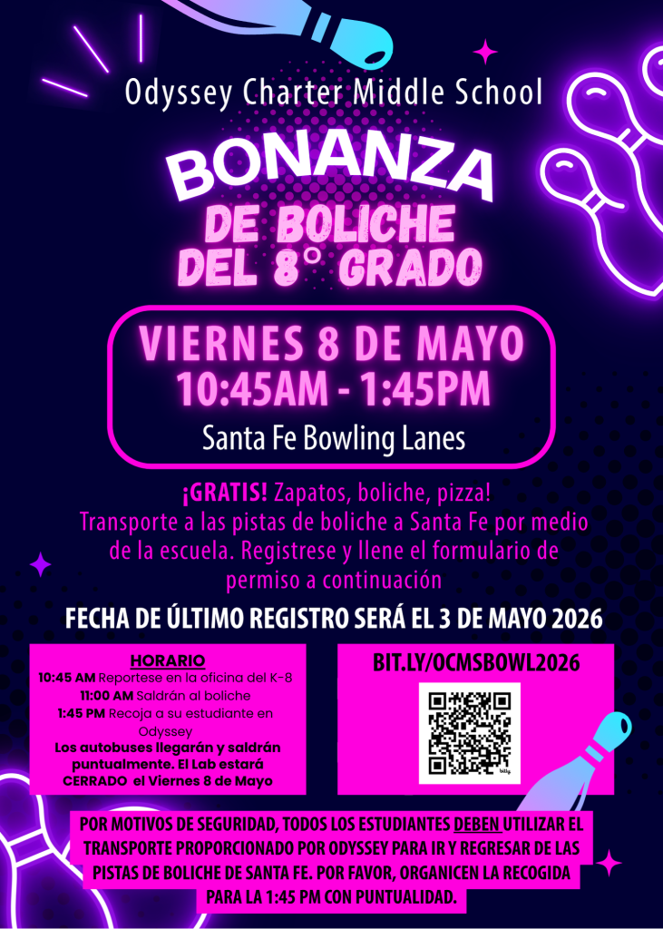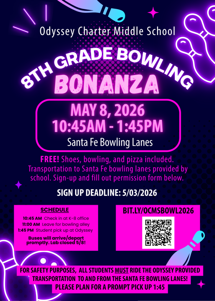 **For safety purposes, all students who attend MUST ride the transportation provided by the school to and from Santa Fe Bowling Lanes. Check in and pick up must be completed at Odyssey Middle School, Building 2. Please plan for a prompt pick up at 1:45 PM.
